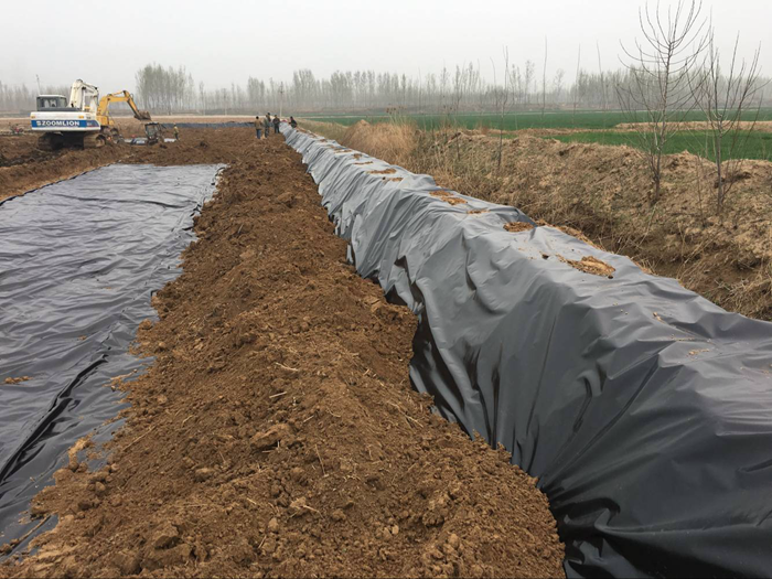 E、防滲膜片材鋪設(shè)平順、貼實(shí)、盡量減少褶皺:鋪設(shè)后及時(shí)壓載或錨固。